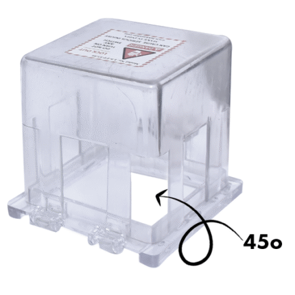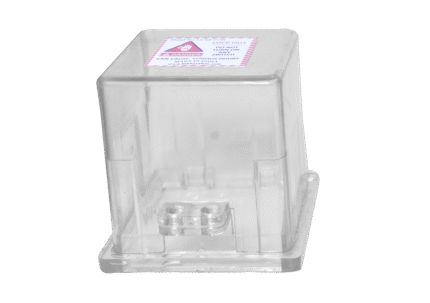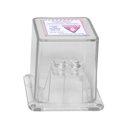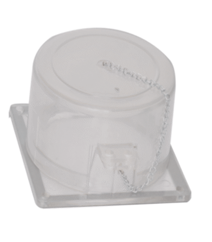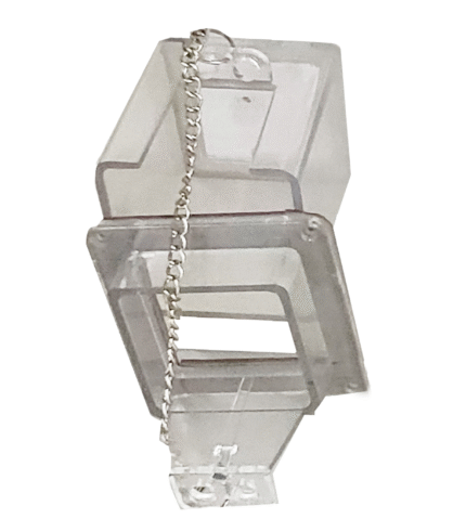 Transparent polycarbonate push button lockout box with hinged lid and retaining chain, designed to fully cover an emergency stop or control push button to prevent accidental or unauthorized operation while keeping it visible.