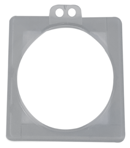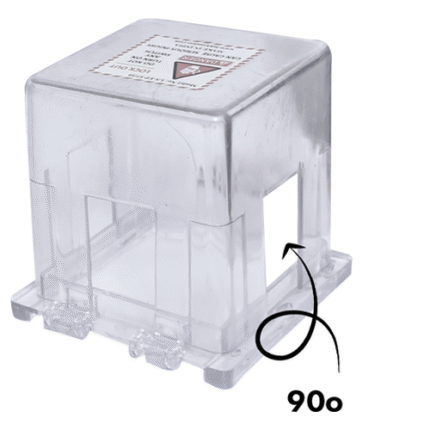 Transparent polycarbonate electrical panel lockout cover for push buttons and rotary switches, designed to fully enclose the control and accept a safety padlock so the switch cannot be operated during LOTO.