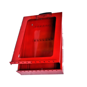 A compact RED / YELLOW / GREY powder coated MS lock box used for the storage of keys and other machine activation devices.