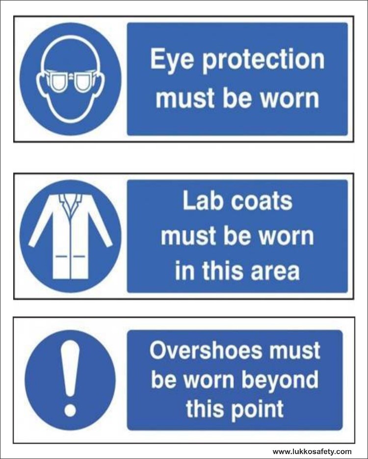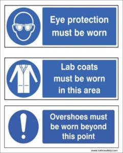 Mandatory PPE sign indicating that eye protection, lab coats and overshoes must be worn before entering or working in the designated laboratory/cleanroom area
