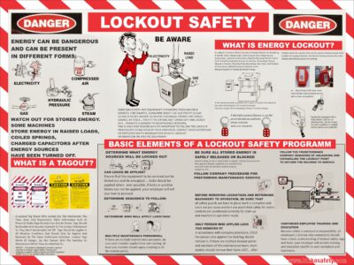Lockout safety awareness poster explaining hazardous energy sources, the concept of energy lockout and tagout, and the basic elements of a lockout safety program for safe maintenance and servicing of machinery.