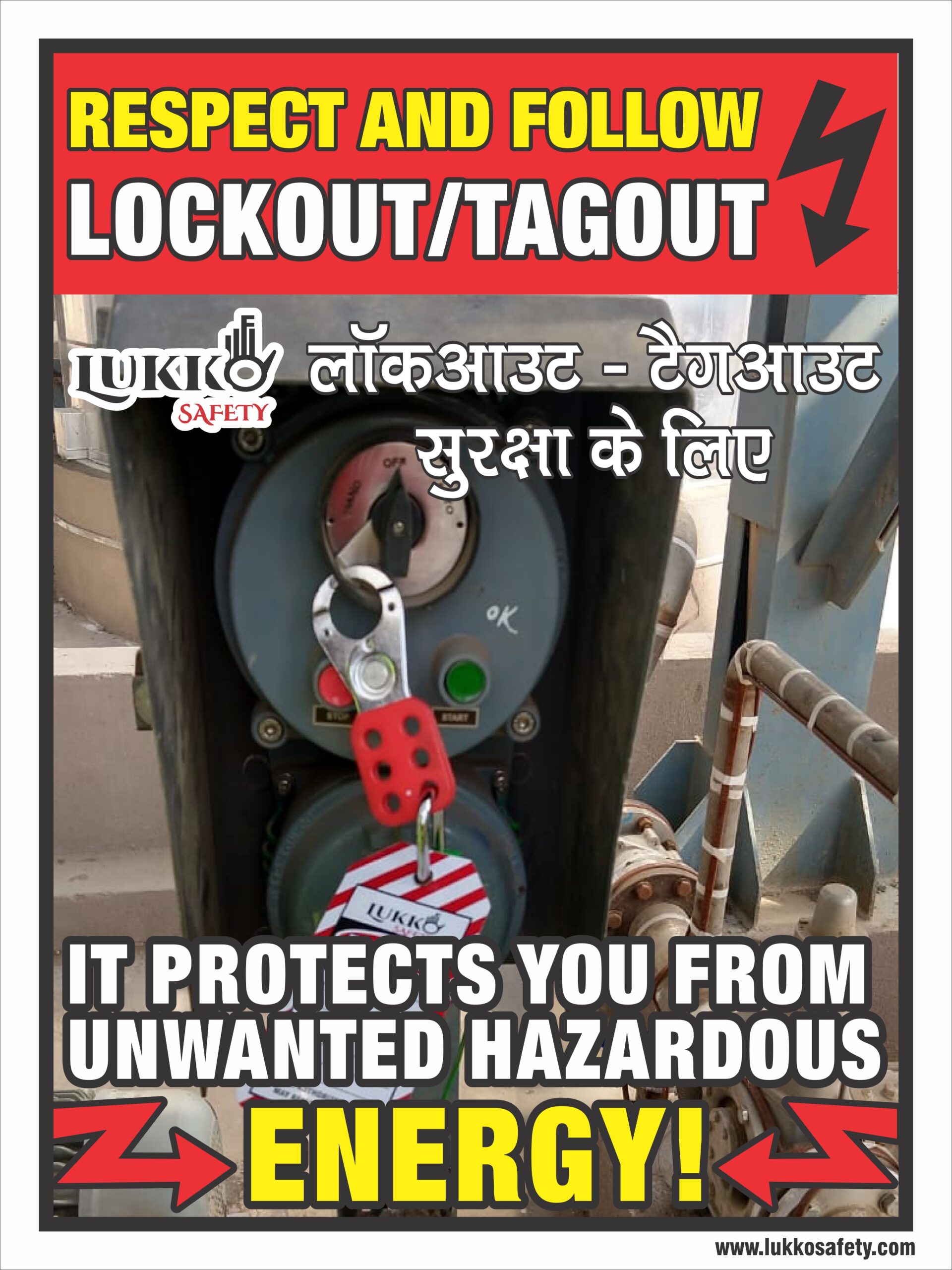 This bilingual Respect and Follow Lockout/Tagout awareness poster reminds workers that proper LOTO practices protect them from unwanted hazardous energy during maintenance and operation tasks