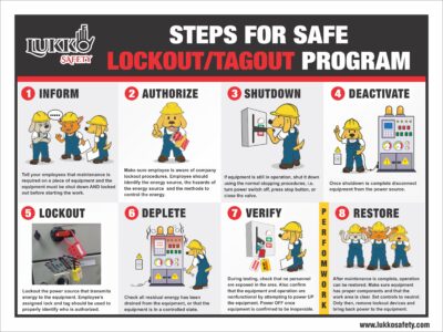 Illustrated 8‑step lockout/tagout program poster explaining how to inform, authorize, shut down, deactivate, lock out, deplete stored energy, verify isolation, and safely restore equipment after maintenance.